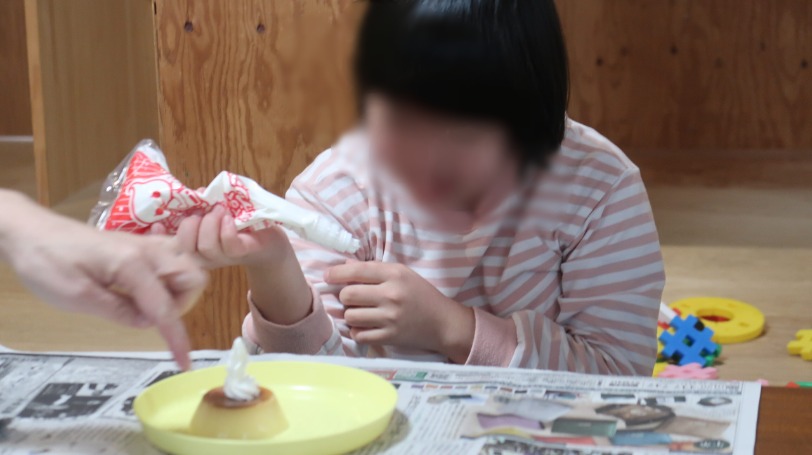 プリンに生クリームを絞って特製デザートに🥰
